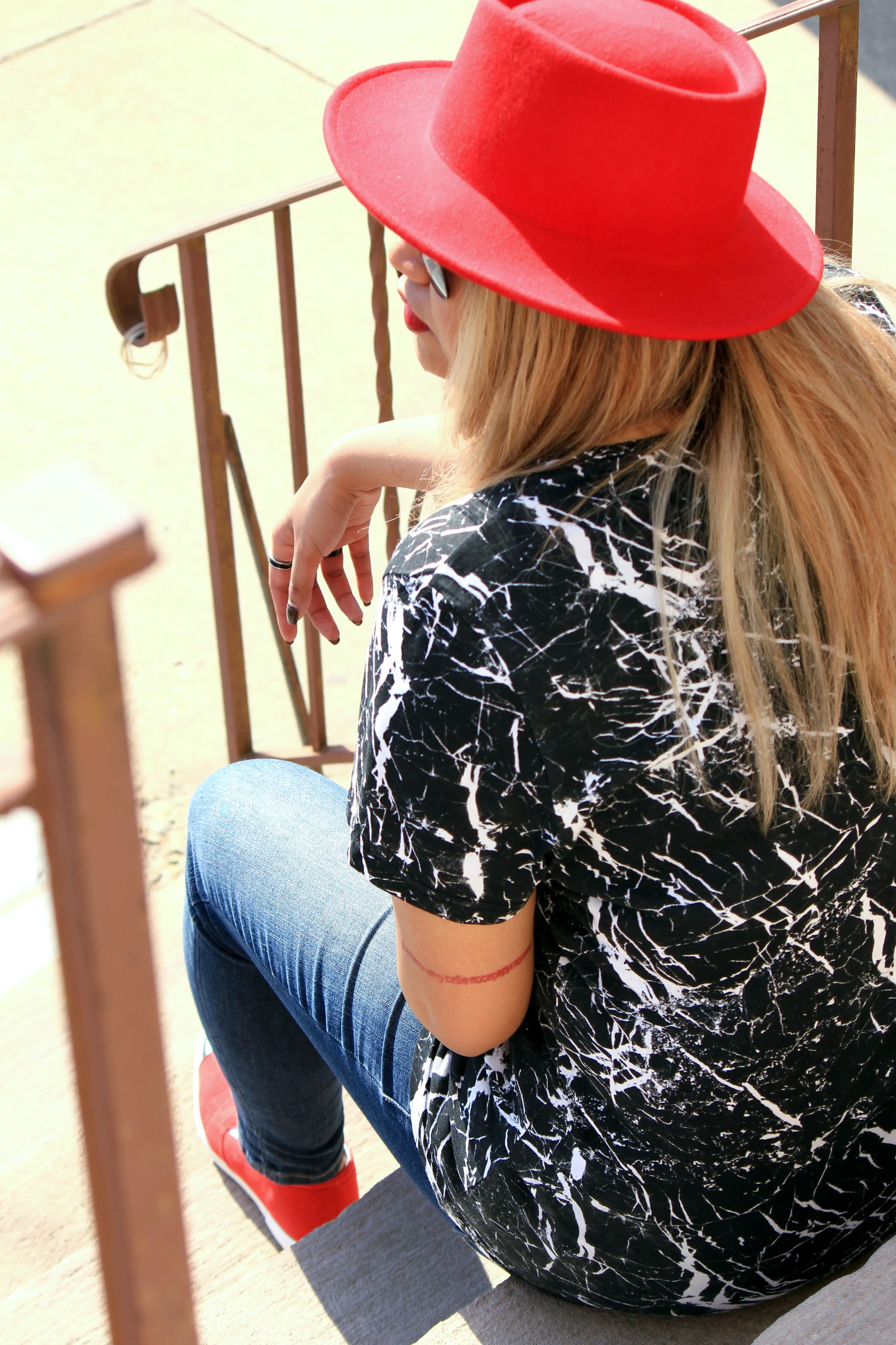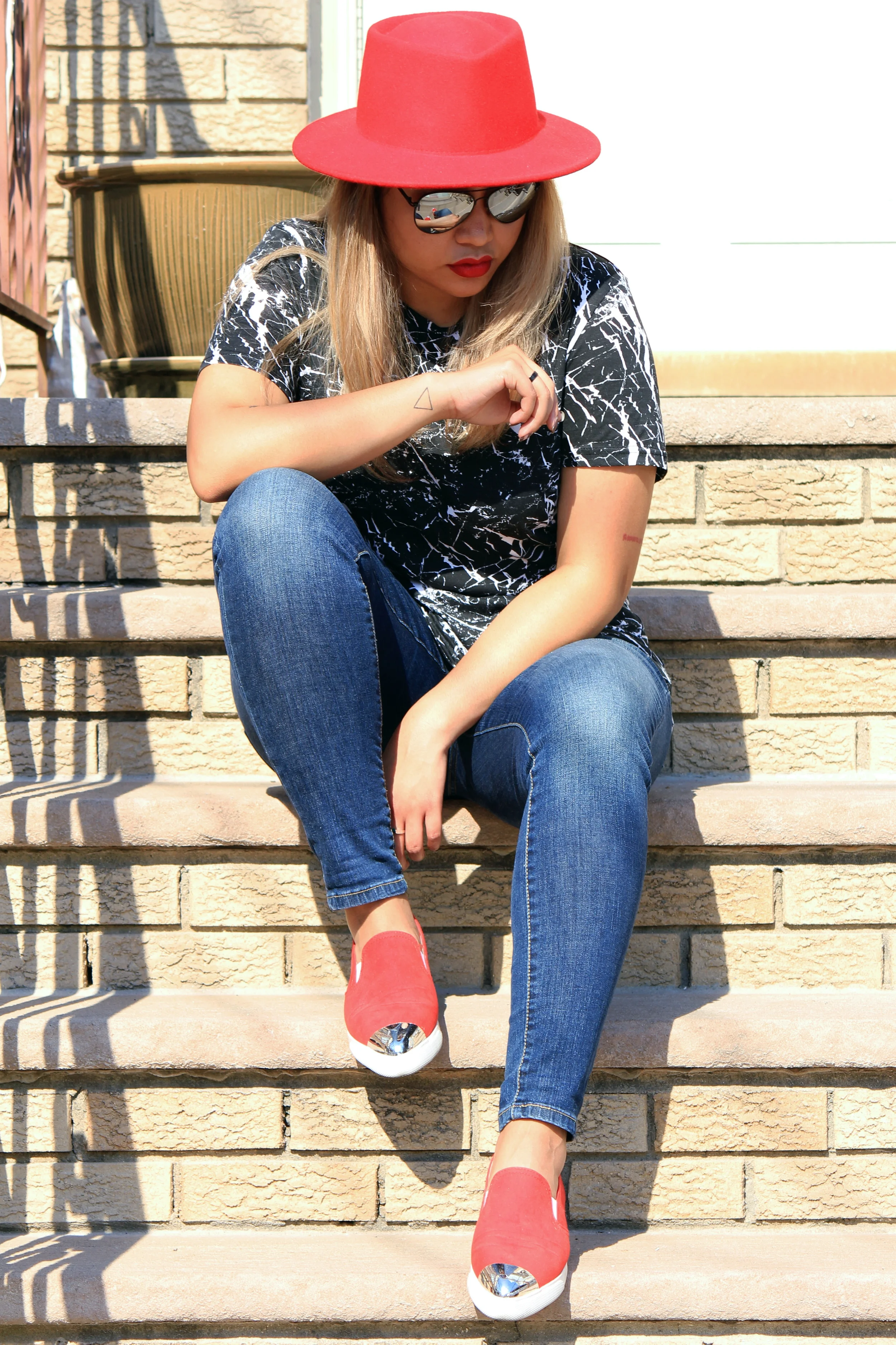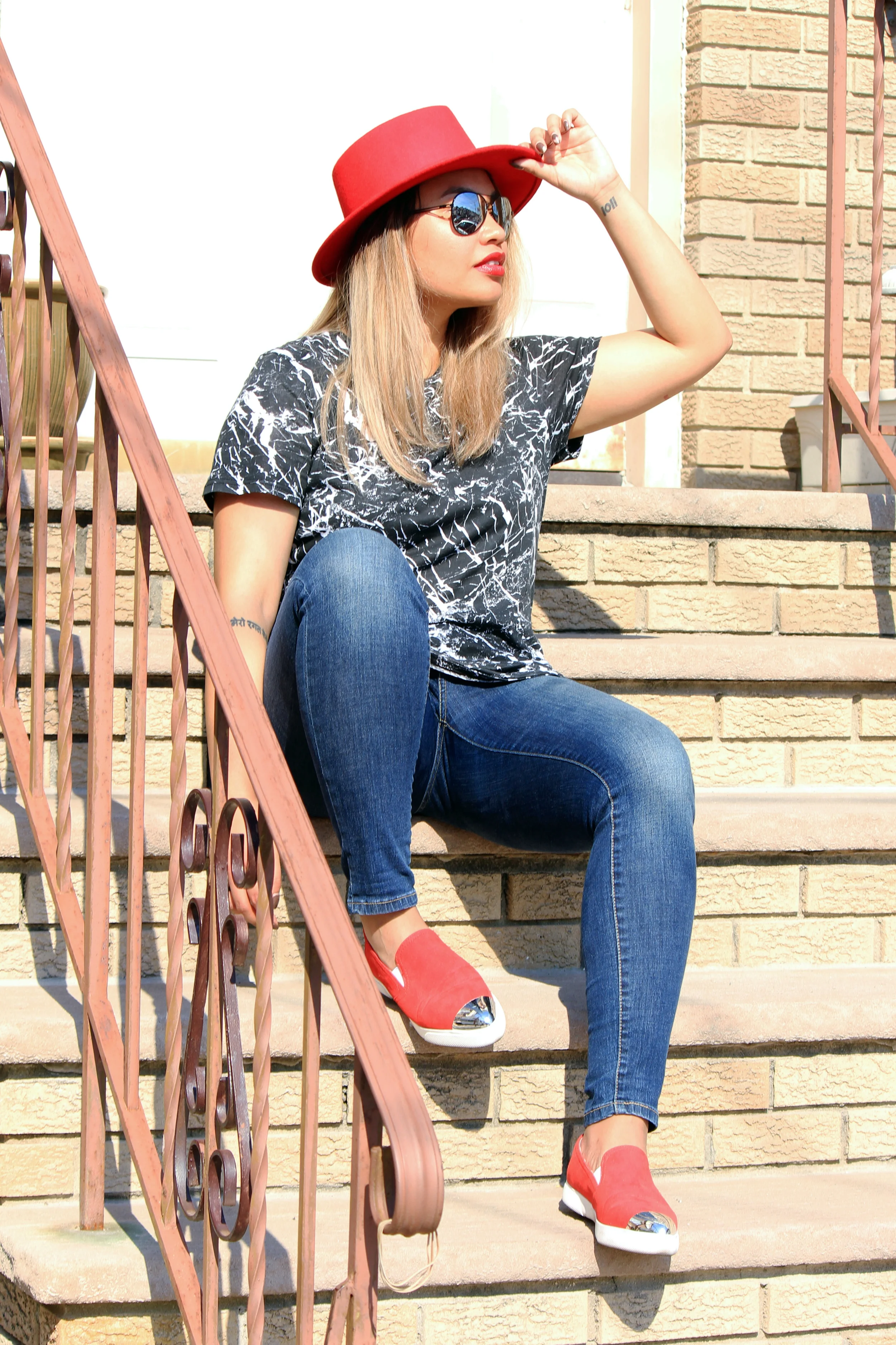 I chose to wear pops of red with my lips, shoes & hat and paired them with the basic jeans & T-shirt combo. I think it's a good way to stand out without being too in-your-face. You just can't go wrong :)
