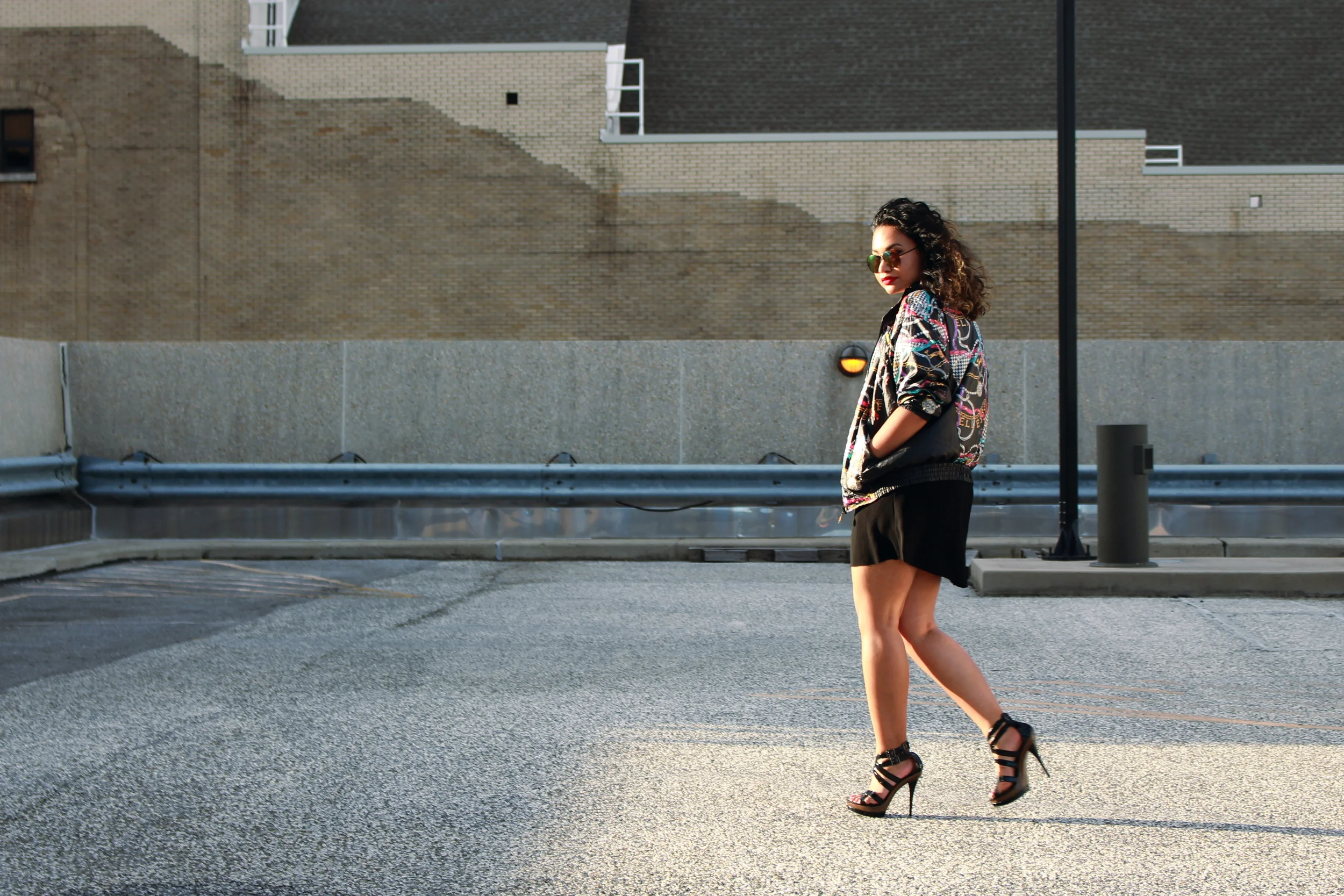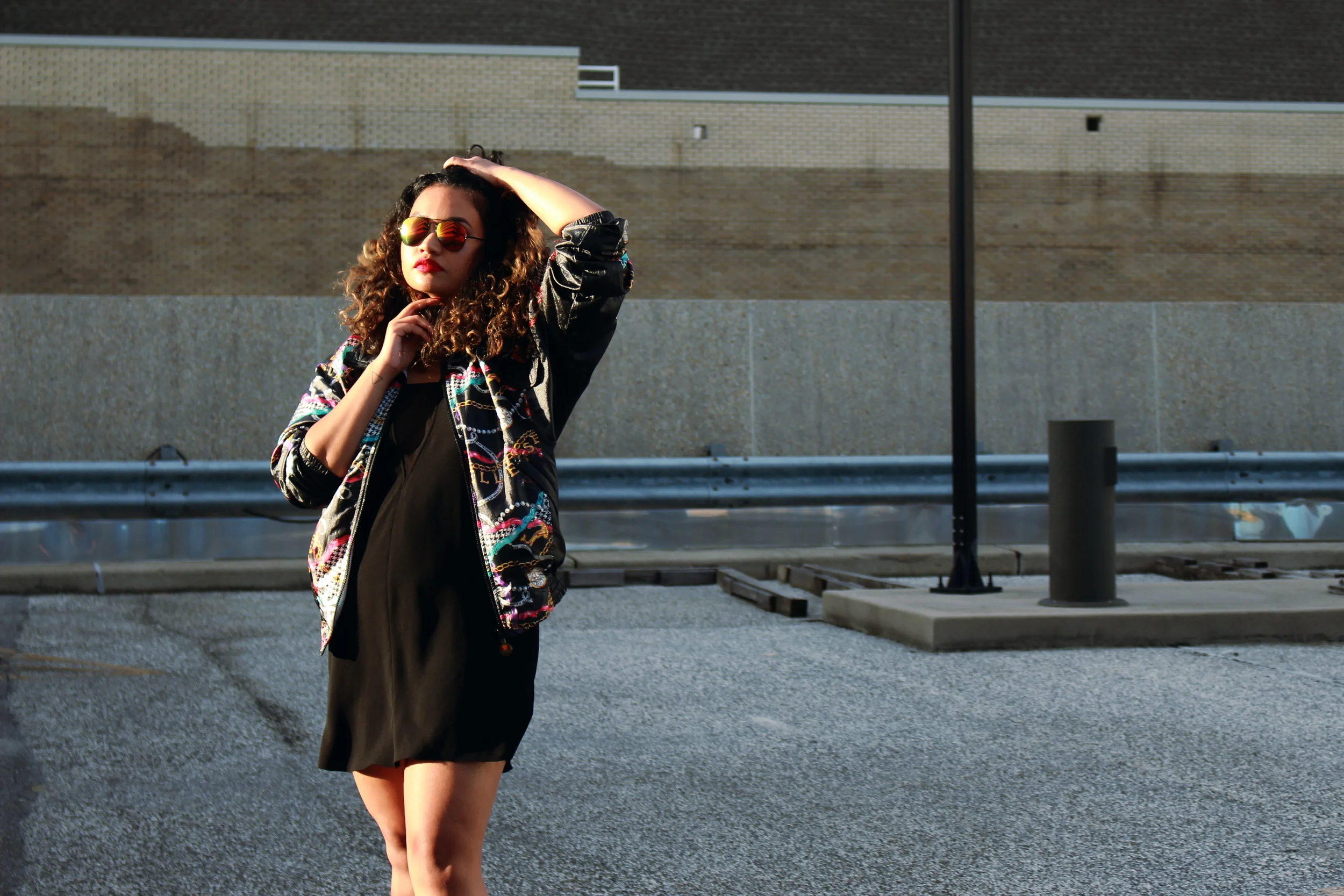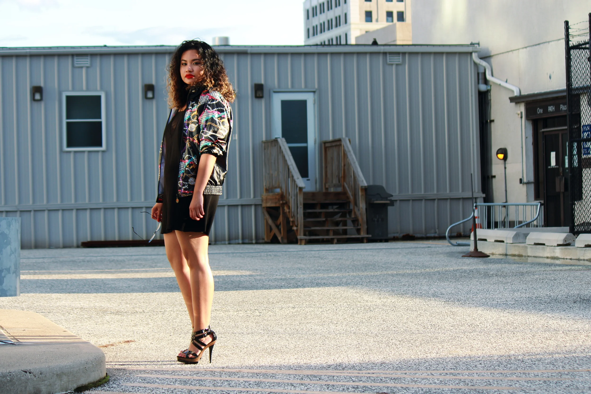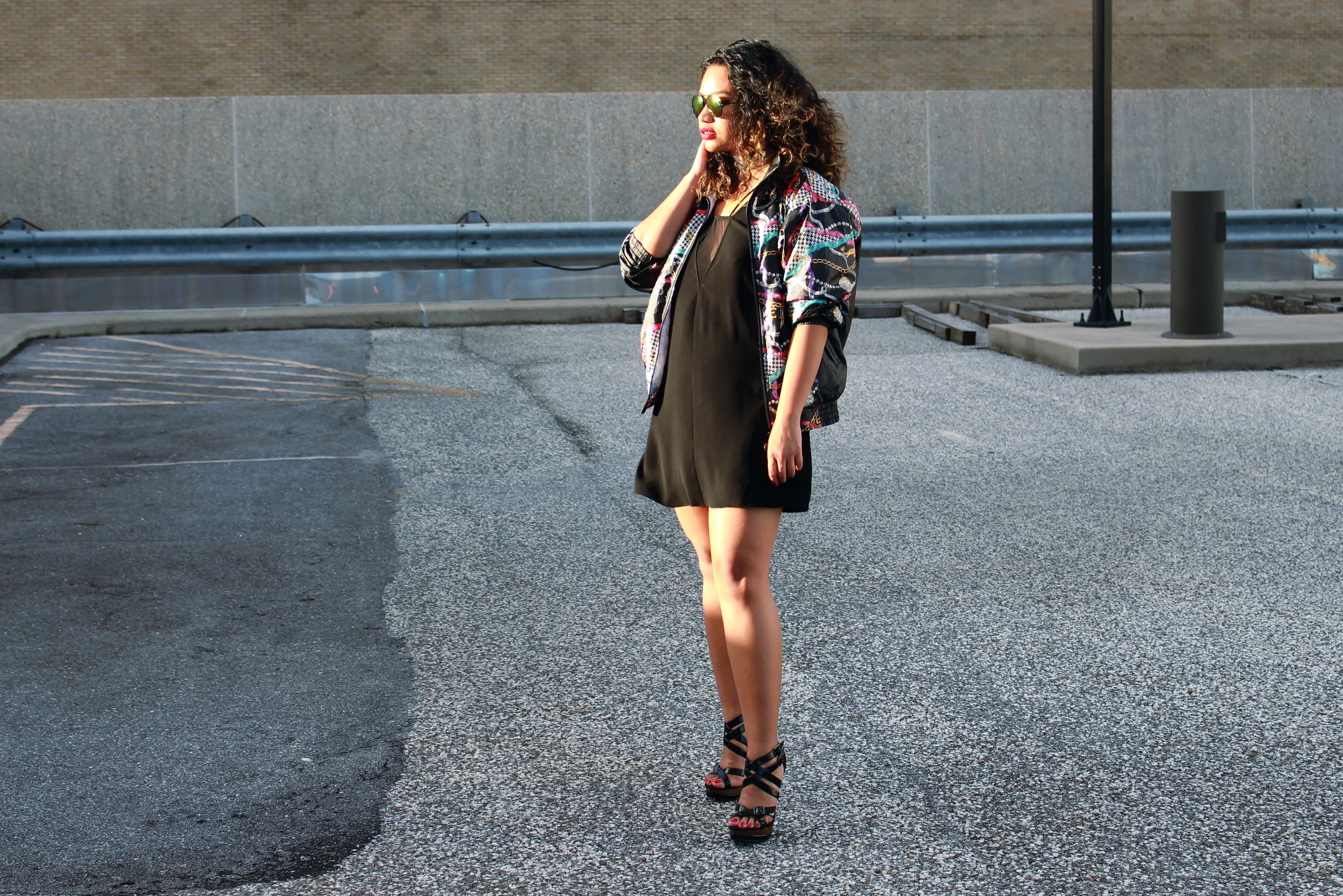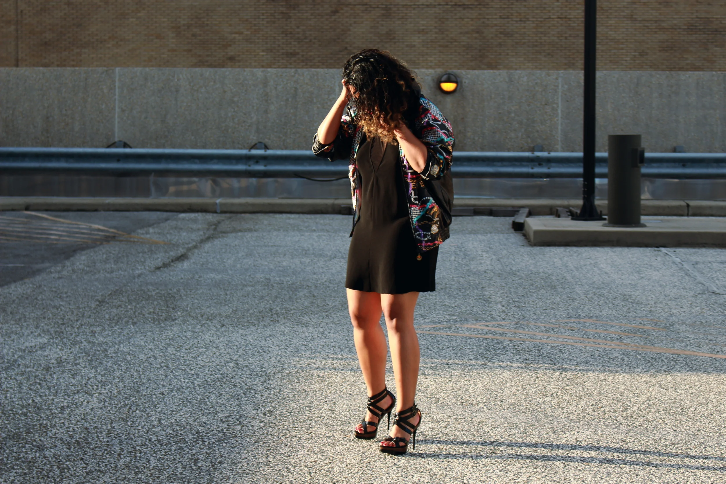 With this outfit, I really wanted to highlight the colors and details on this jacket. An easy way to do that is to wear all black. Bomber jackets are usually worn dressed down so I dressed it up with a slip dress & some strappy platform heels.