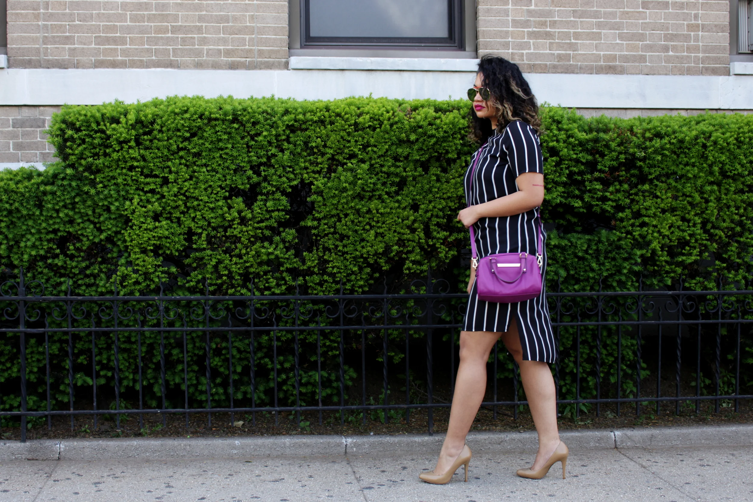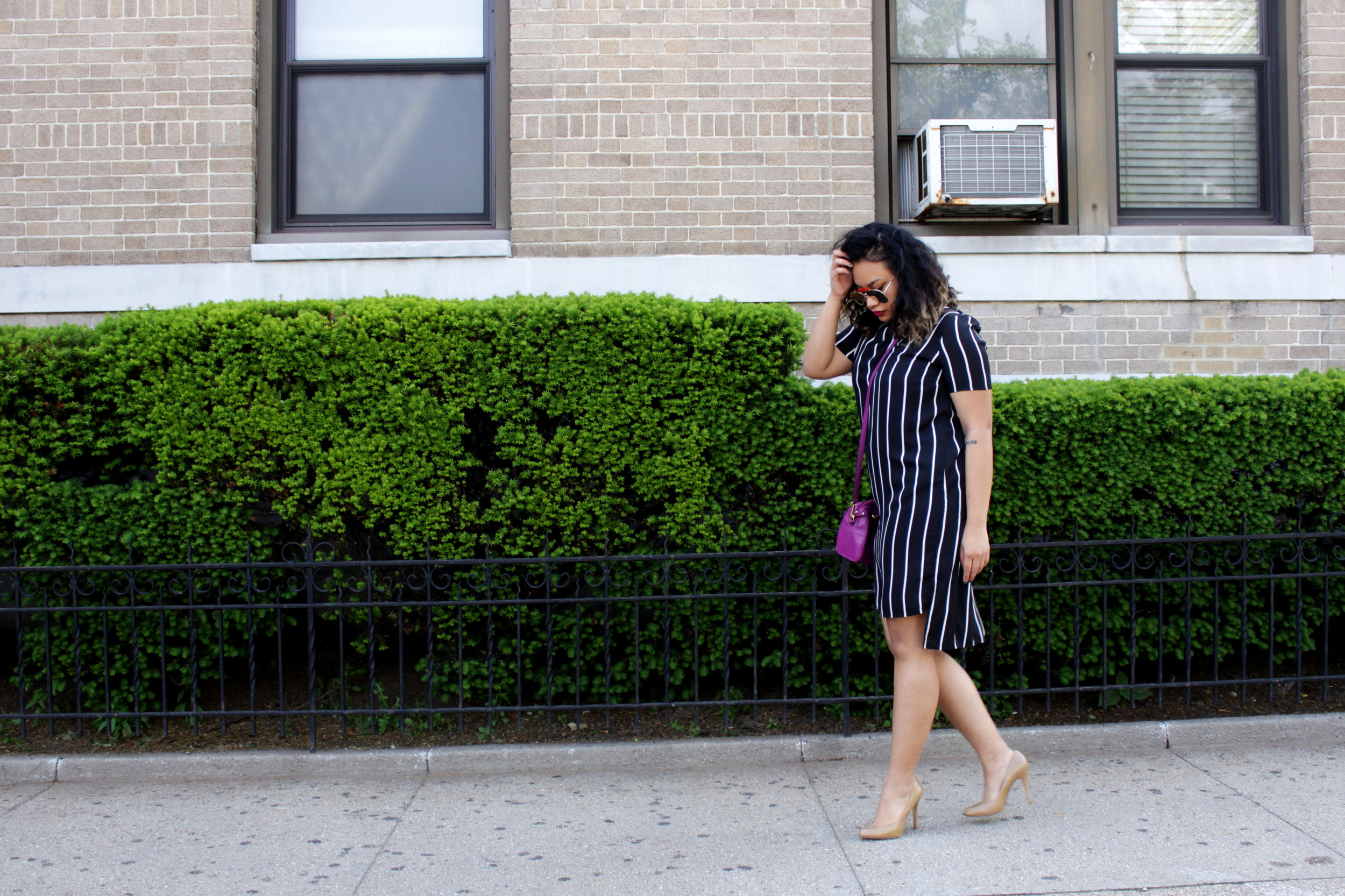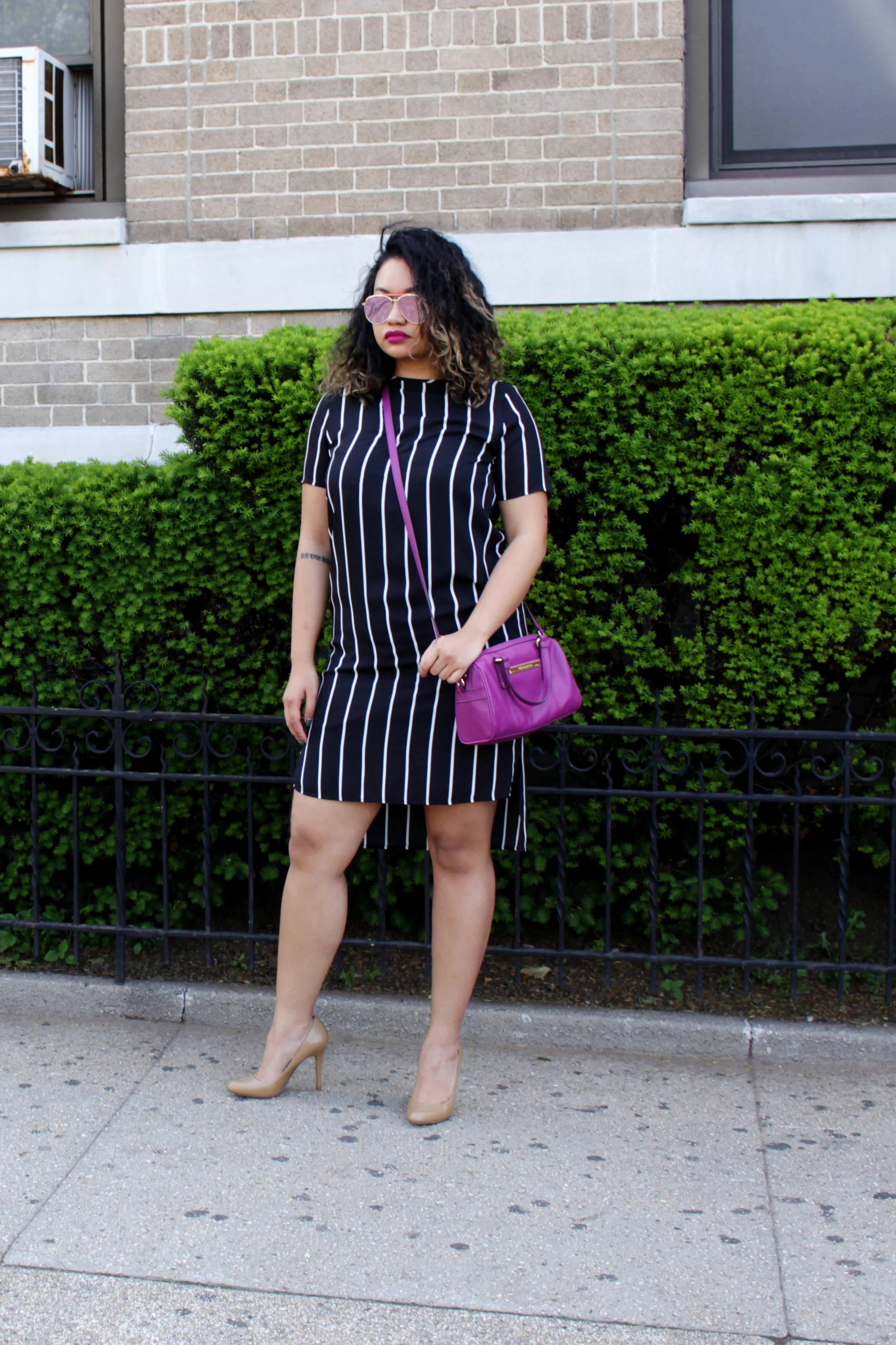 The nude pumps makes this striped shift dress work appropriate. And of course I can't make it boring. I had to add a pop of color with my magenta crossbody purse & a pair of massive pink mirrored lens sunnies.